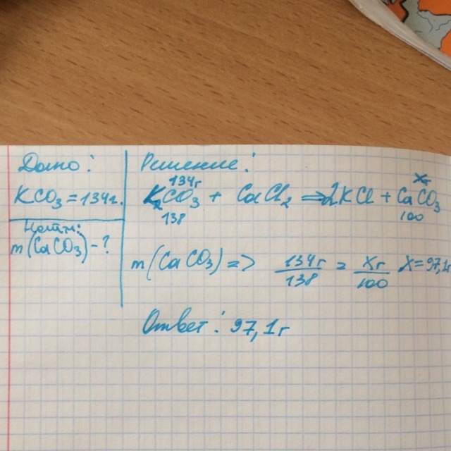вычислите массу осадка образовавшегося при взаимодействии раствора содержащего 134г карбоната калия при взаимодействии с хлоридом кальция