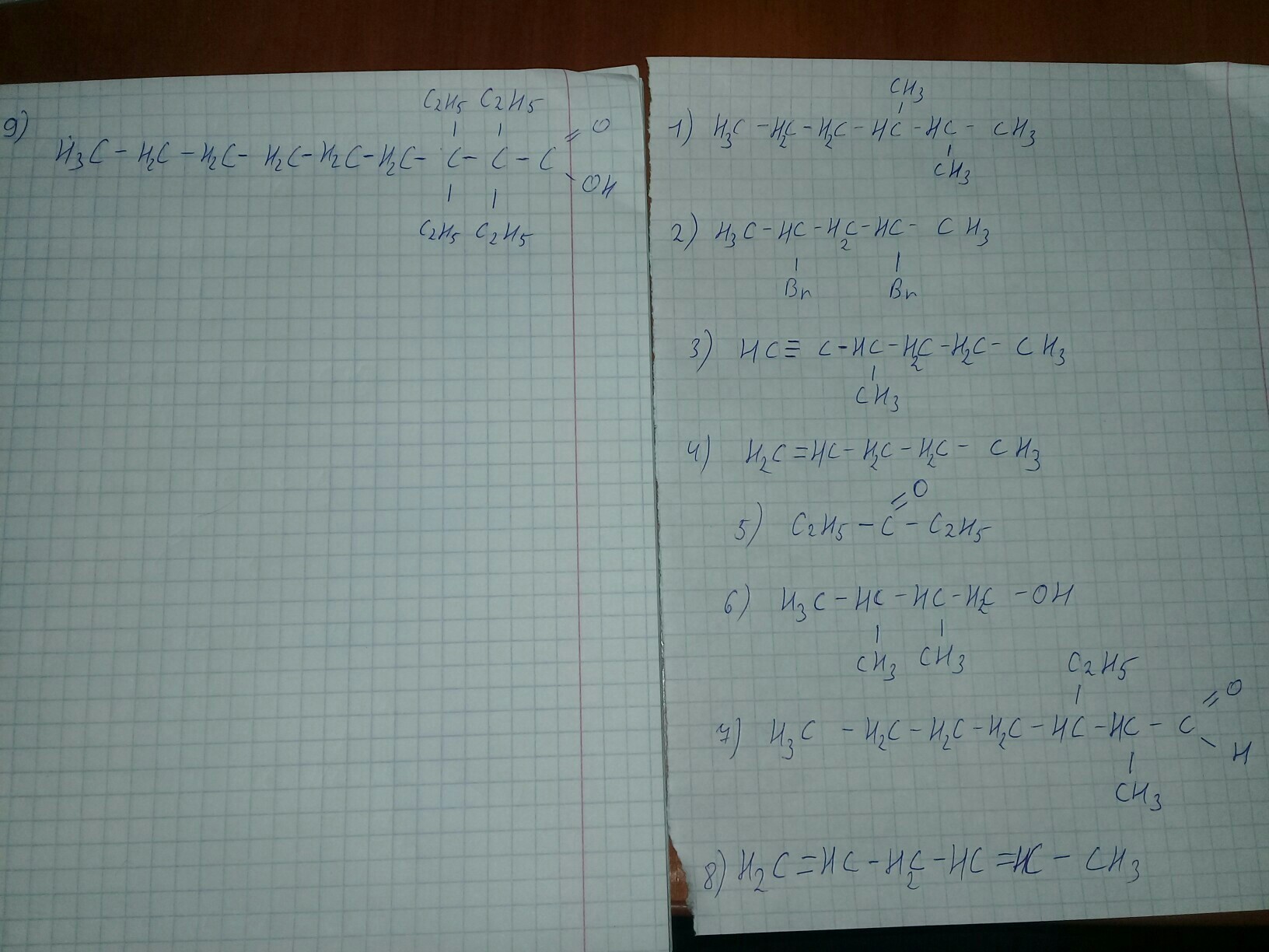 2,3-диметилгексан; 2,4-дибромпентан; 3-метилгексин-1; 2-метил-3-этилгексен-1; пентен-1; диэтилкетон; 2,3-диметилбутанол-1; 2-метил-3-этилгептаналь; гексадиен-1,4; 2,2,3,3-тетраэтилнонановая кислота