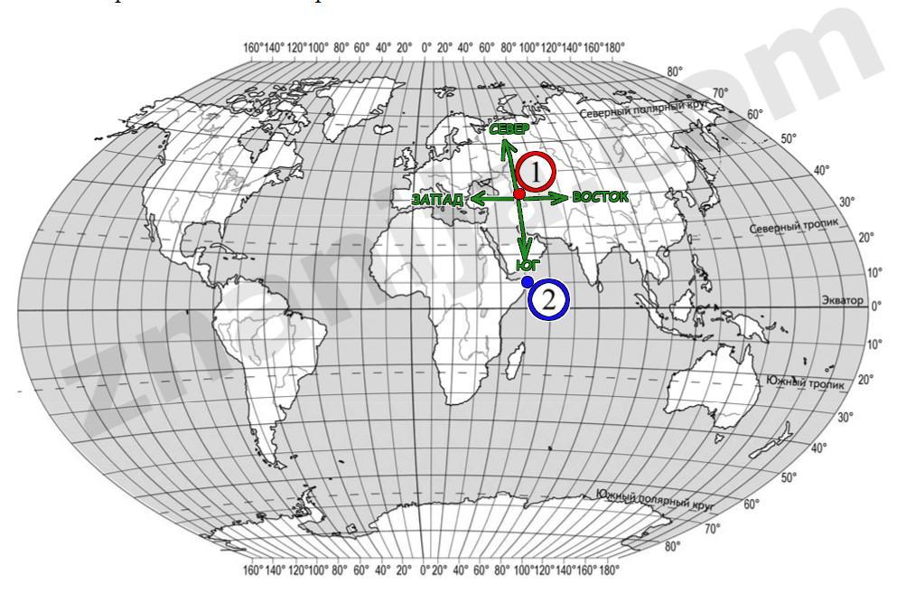 Поставьте точки на карте по приведённым ниже координатам. Обозначьте эти точки соответственно цифрам 1и 2. Точка 1-42° с.ш.. 51° в.д. Точка 2-10° с.ш. 51° в.д. В каком направлении от точки 1 расположена точка 2?