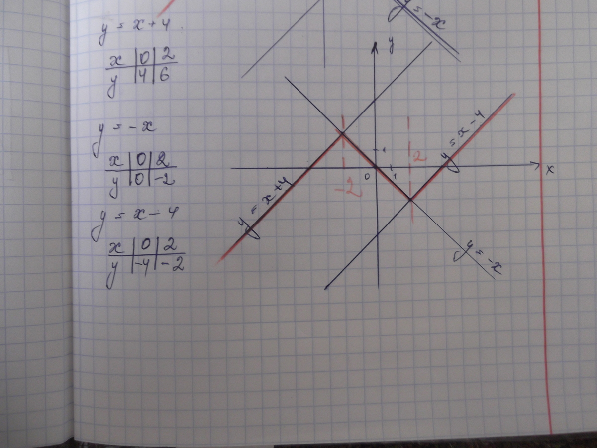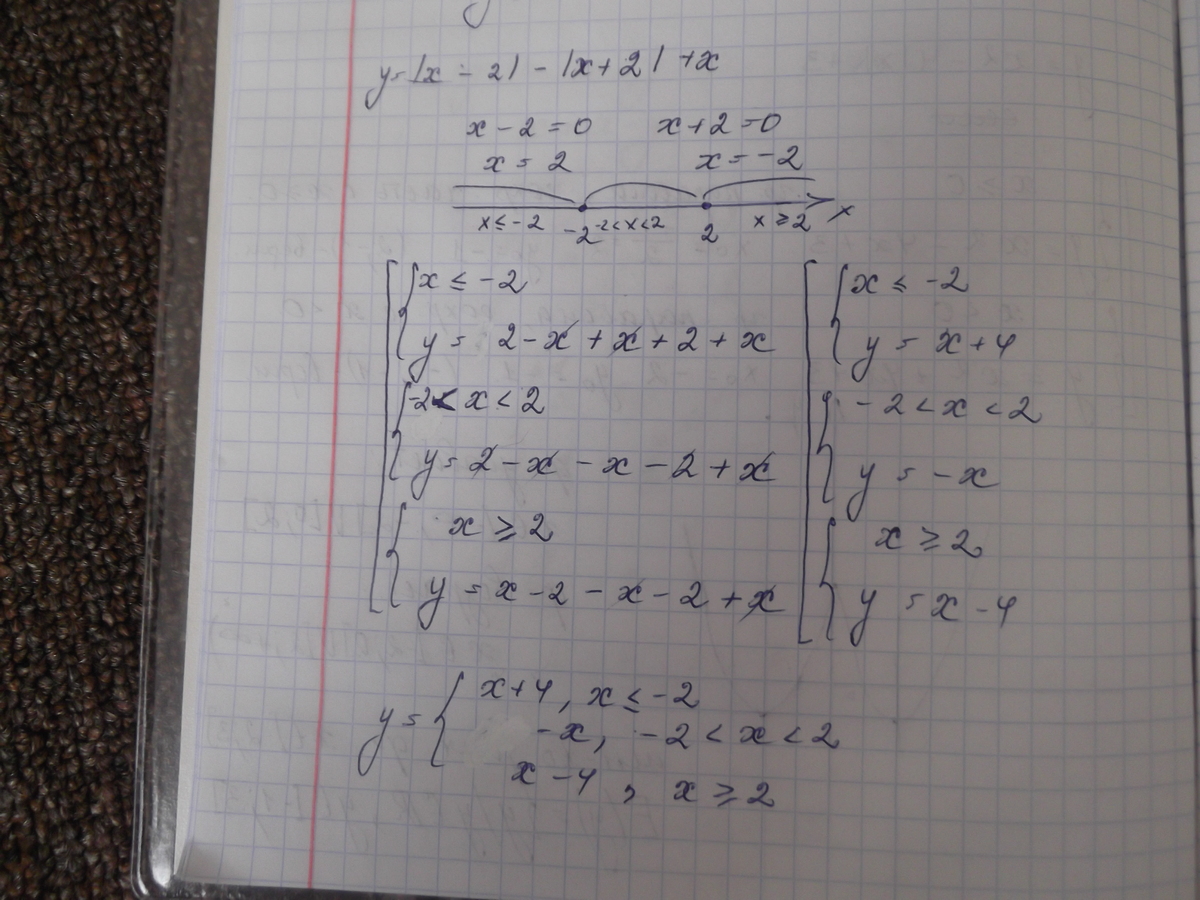 Дальше числовая прямая и отмечаешь на ней полученные значения х и рассматриваешь каждый промежуток отдельно, подставляя значения ТОЛЬКО в модуль, получаешь знак выражения под модулем и снимаешь сам модуль (т.е. если рассматриваем первый промежуток x<= -2, то берем любое значение, например х=-3, и подставляем (-3 - 2) <0, значит снимаем модуль с минусом, -3 +2, опять же меньше нуля, снова с минусом).