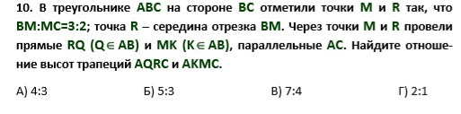 Возьмем ВМ за 3х, тогда МС за 2х, т.к. ВС:МС как 3:2, по условию. Т.к. ВМ=ВR, по условию, то RM= 1,5х, следовательно RC=3,5x, тогда отношение сторон RC:MC, трапеций AQRC и AKMC, будет равно отношению их высот, соответственно.