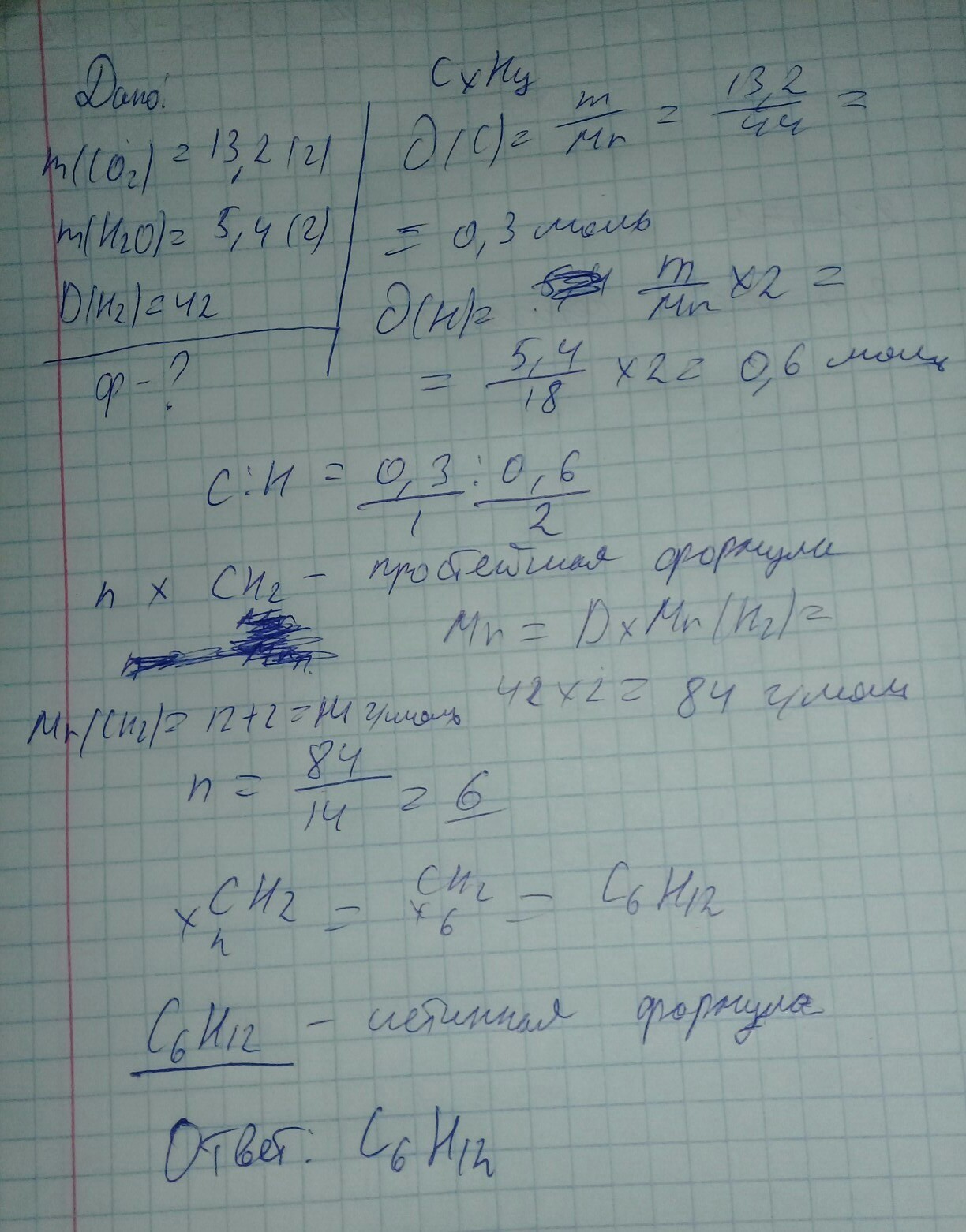 знайдіть молекулярну формулу вуглеводню, відносна густина якого за воднем дорівнює 42, якщо при спалюванні 4,2г. його утворюється 13,2г Co2 і 5,4 г H2O