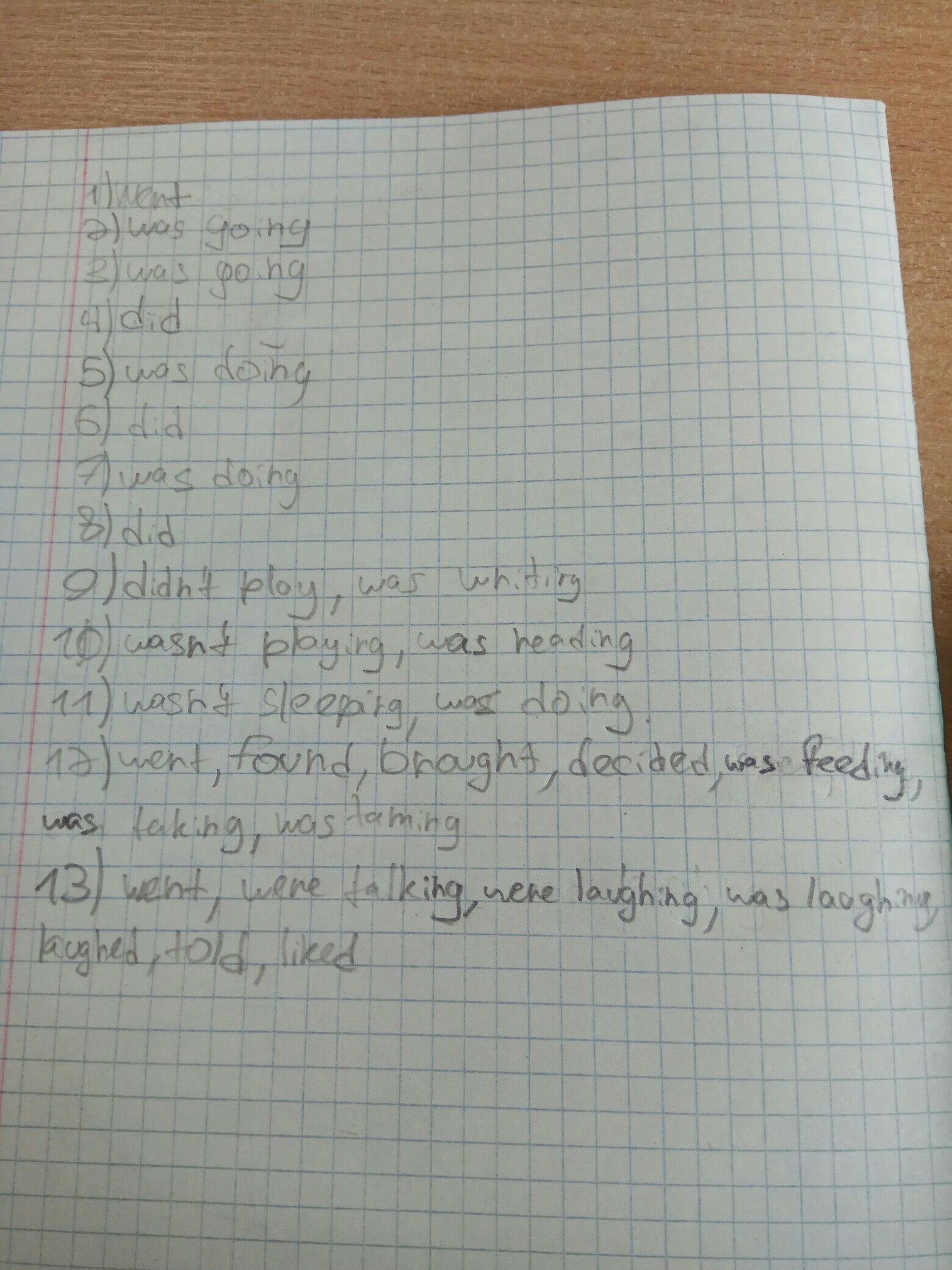 1. I (to go) to the cinema yesterday. 2. I (to go) to the cinema at four o'clock yesterday. 3. I (to go) to the cinema when you met me. 4. I (to do) my homework the whole evening yesterday. 5. I (to do) my homework when mother came home. 6. I (to do) my homework yesterday. 7. I (to do) my homework from five till eight yesterday. 8. I (to do) my homework at six o'clock yesterday. 9. I (not to play) the piano yesterday. I (to write) a letter to my friend. 10. I (not to play) the piano at four o'clock yesterday. I (to read) a book. 11. He (not to sleep) when father came home. He (to do) his homework. 12. When we were in the country last summer, I (to go) to the wood one day. In the wood I (to find) a little fox cub. I (to bring) it home. I (to decide) to tame the cub. Every day I (to feed) it and (to take) care of it. I (to tame) it the whole summer. Now the fox cub is quite tame. It lives in my house. 13. When I (to go) to school the day before yesterday, I met Mike and Pete. They (to talk) and (to laugh). They told me a funny story. Soon I (to laugh), too. I still (to laugh) when we came to school. After school I (to tell) this story at home. My father and mother (to like) it very much.
