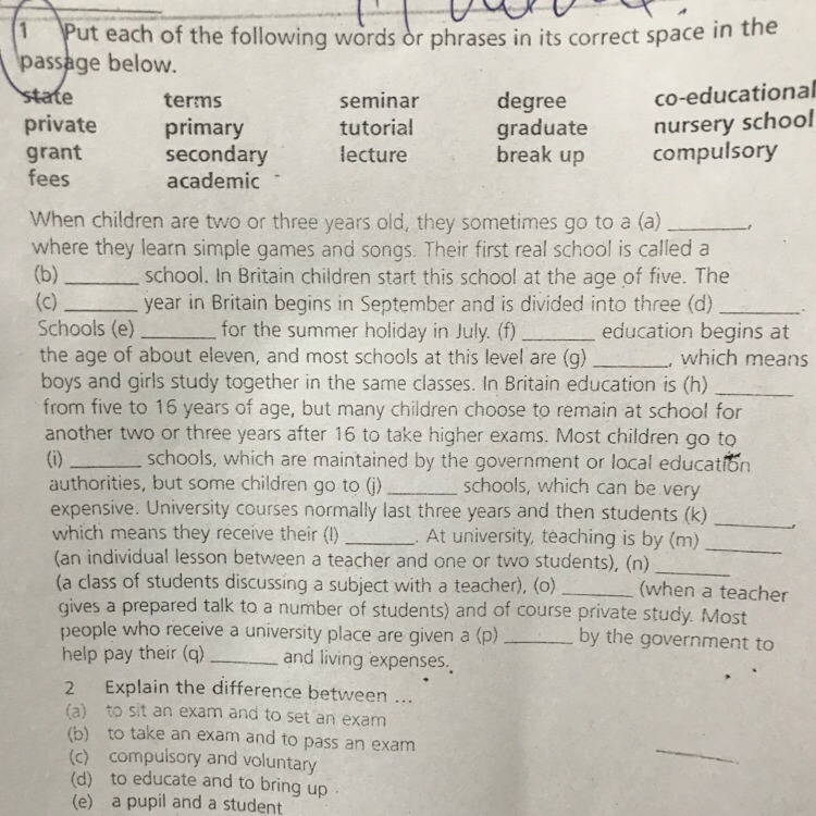 a) a nursery school b) primary c) academic d) terms e) break up f) secondary g) co-educational h) compulsory i) state j) grant k) private