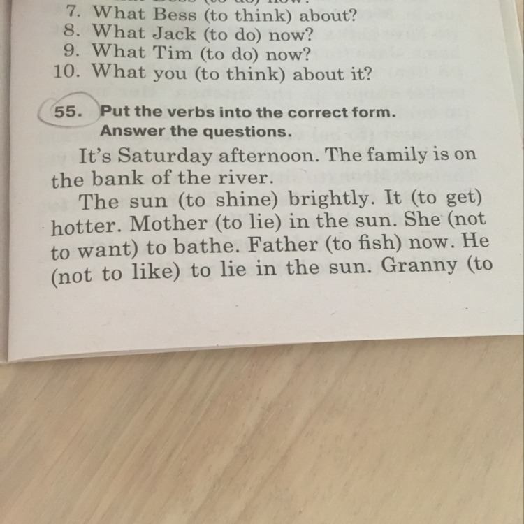 В 55 упражнении нужно поставить глаголы в правильной форме, то есть употребить правильное время для правильного лица. Потом нужно ответить на вопросы. Например, The sun is shining brightly. It's getting hotter. Mother is lying in the sun. She doesn't want to bathe...