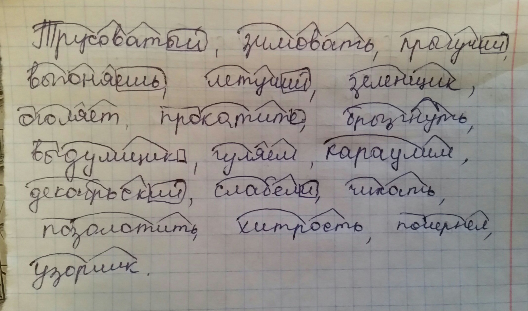 Помогите ПОЖАЛУЙСТА разбор слов по составу:трусоватый, зимовать, прыгучий, выгоняешь, прыгучий, летучий, зеленщик, оголяет, прокатите, брызнуть, выдумщик, гуляем, караулим, декабрьский, слабели, чихать, позолотить, хитрость, почернел, узорчик