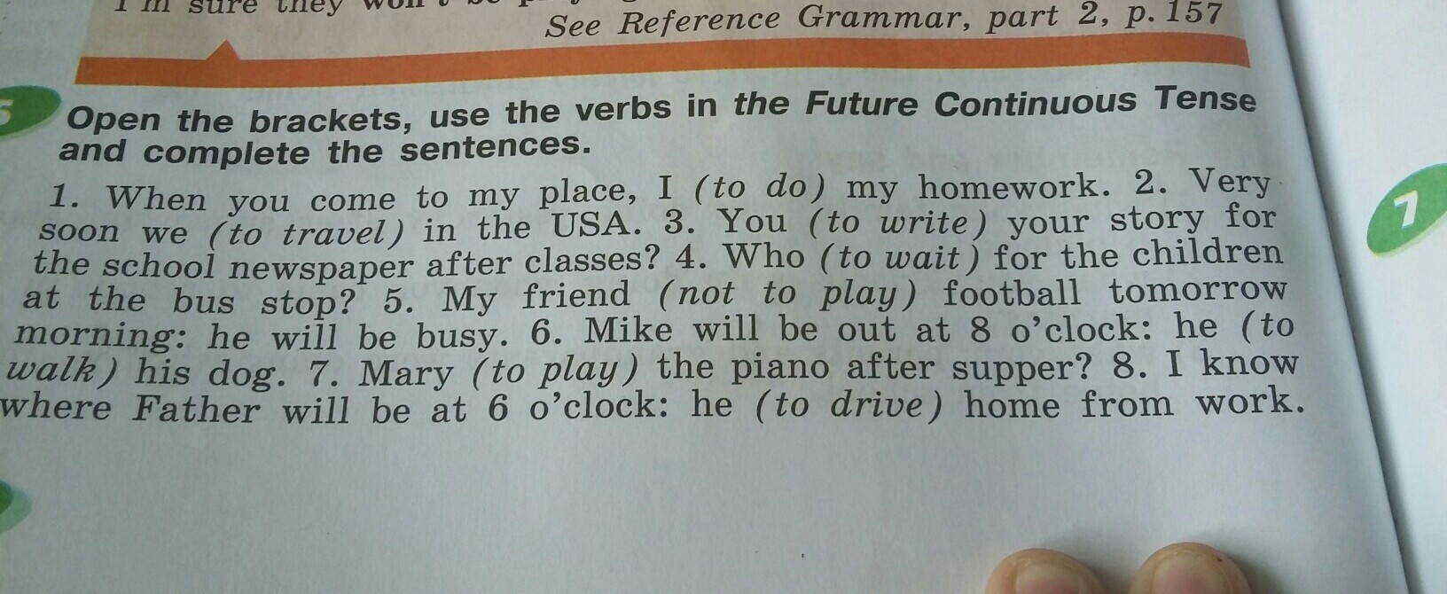 1 will be doing 2 will be travelling 3 will be writing 4 will be waiting 5 will not be playing 6 will be walking 7 will Mary be playing 8 will be driving home