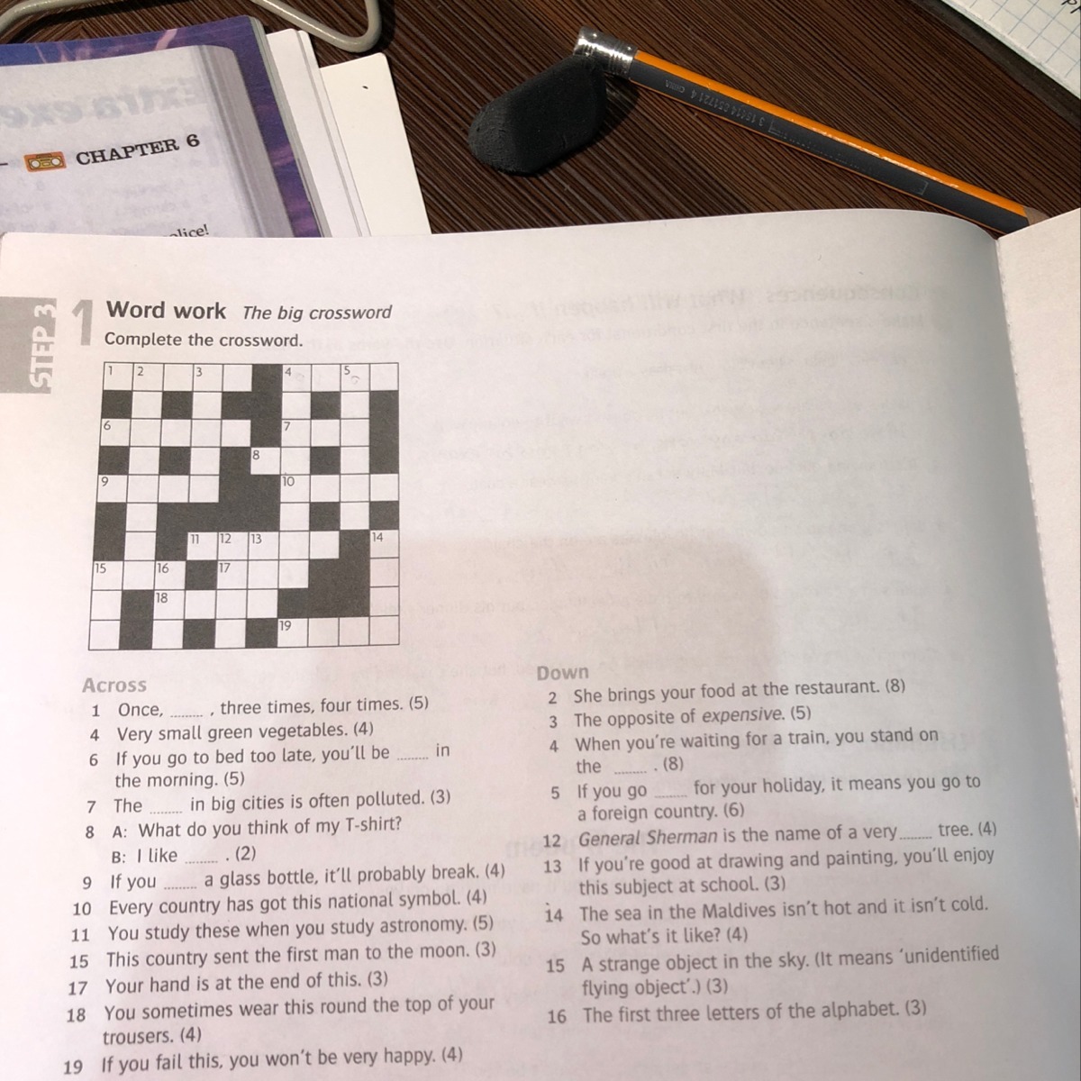 2 waitress 3 cheap 4 platform 5 abroad 12 tall 13 art 14 warm 15 ufo 16 abc