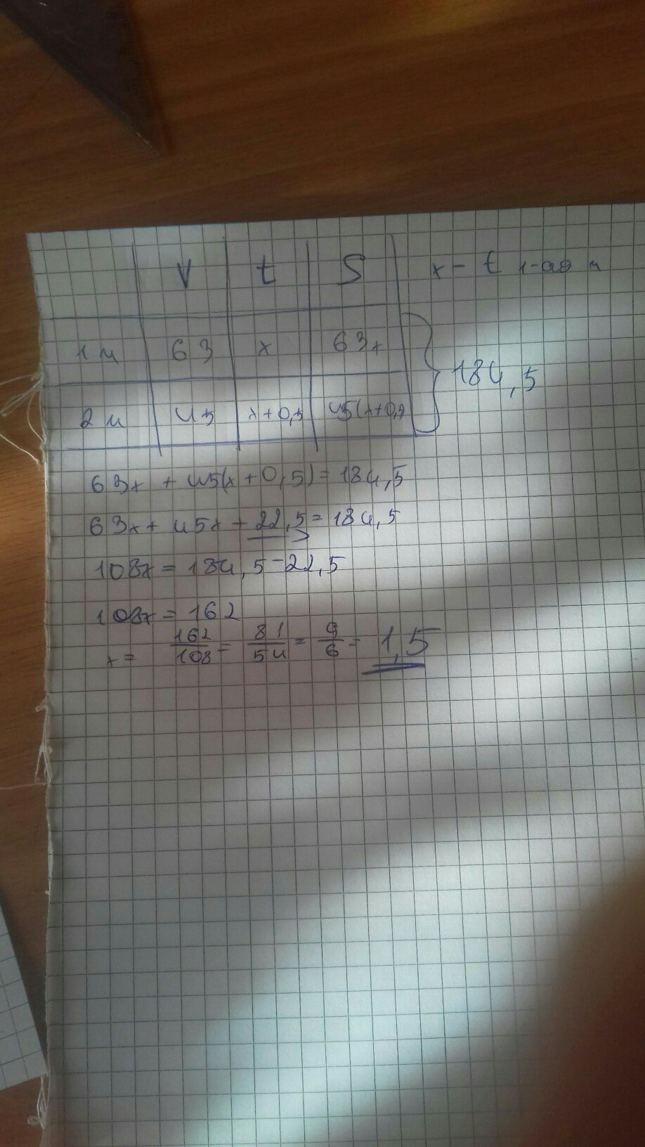 первую часть пути мотоциклист проехал со скоростью 63 км/час , а второю со скоростью 45 км/час. Всего прошел 184,5 км. за какое время мотоциклист проехал первую часть пути и за сколько вторую , если на первую часть он потратил на 0,5 часа меньше , чем на вторую.