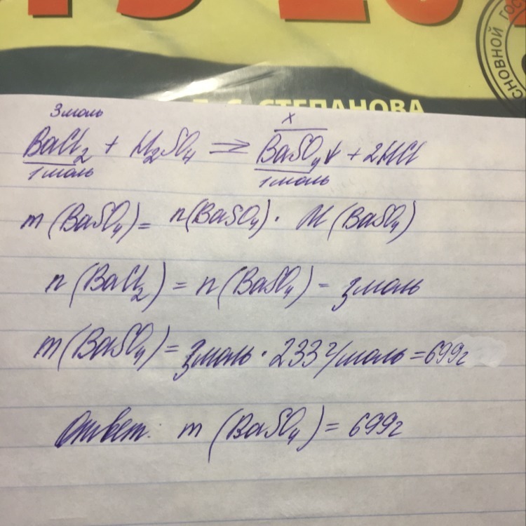 Вычислите массу осадка, образующегося в реакции 3 моль хлорида бария с раствором серной кислоты.