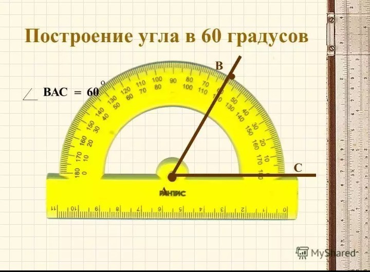 Берёшь транспортир отмеряешь нужное количество градусов и чертить линию