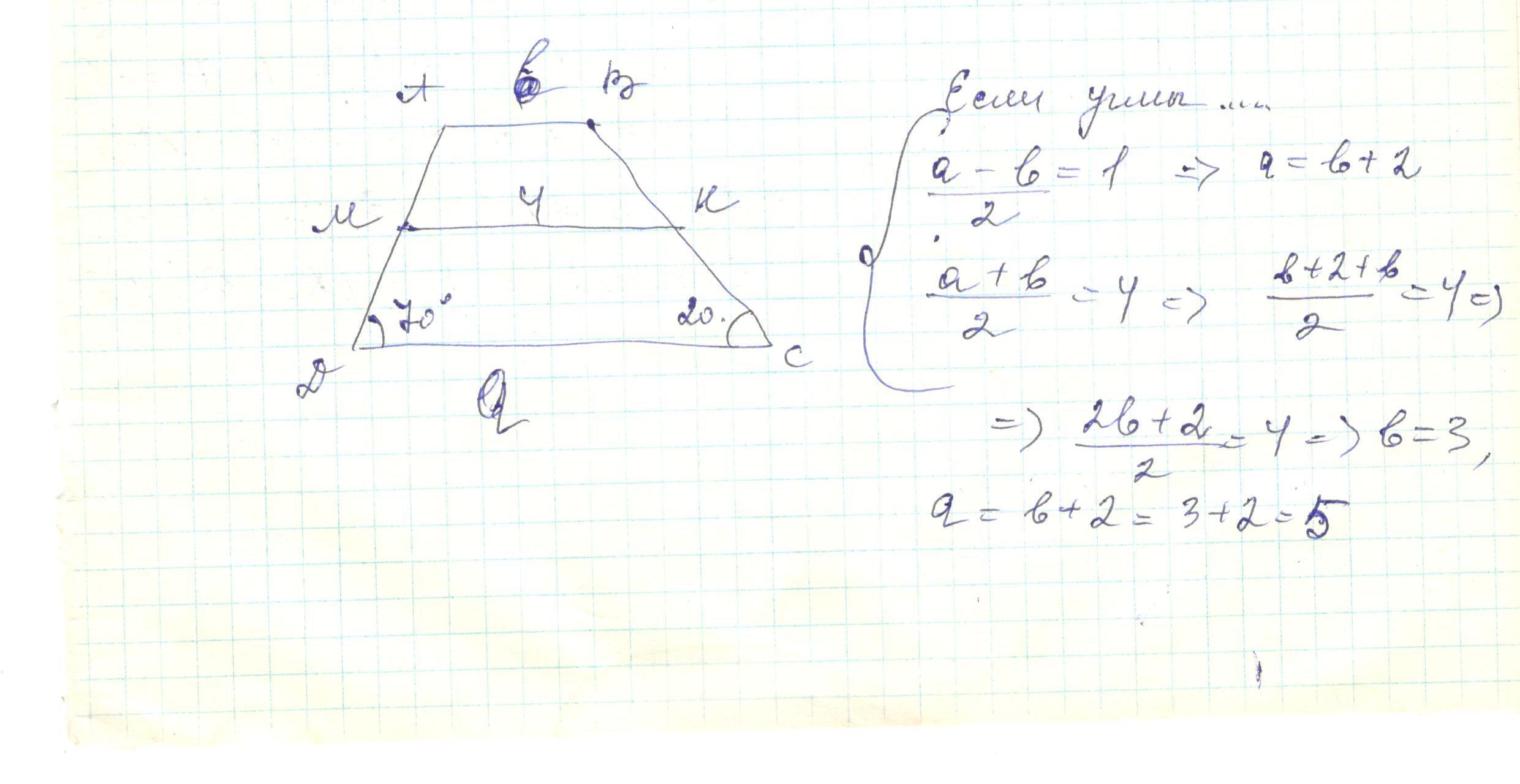 Средняя линия трапеции равна 4 см, а углы при одной из основ 20 ° и 70 °. Найдите основы трапeции, если отрезок соединяющий их сeрeдины равна 1 см.