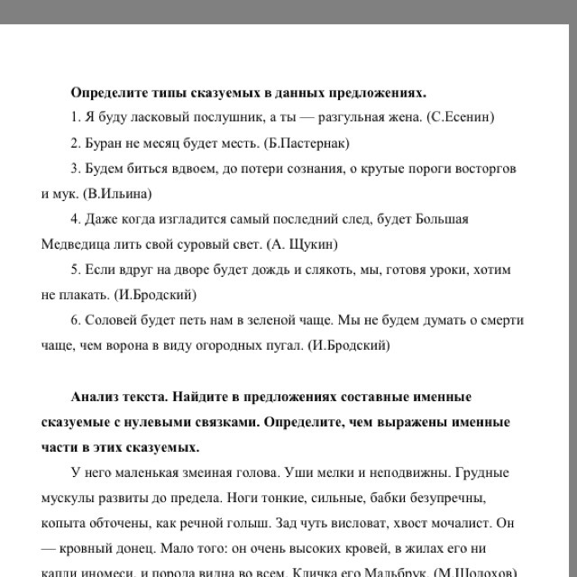 У него маленькая змеиная голова. (есть голова-нулевая связка) Уши мелки и неподвижны. ( уши есть мелки и непослушны-составное именное ) Грудные мускулы развиты (развиты-составное именное, нулевая связка)до предела. Ноги тонкие, сильные, бабки безупречны, копыта обточены, как речной голыш.( составное глагольное-нулевая связка) Зад чуть висловат, хвост мочалист. (составное именное, нулевая связка)Он — кровный донец (соствн именное, нулевая связка) Мало того: он очень высоких кровей, в жилах его ни капли иномеси, и порода видна во всем. Кличка его Мальбрук. (М.Шолохов)(составное глагольное, нулевая связка)
