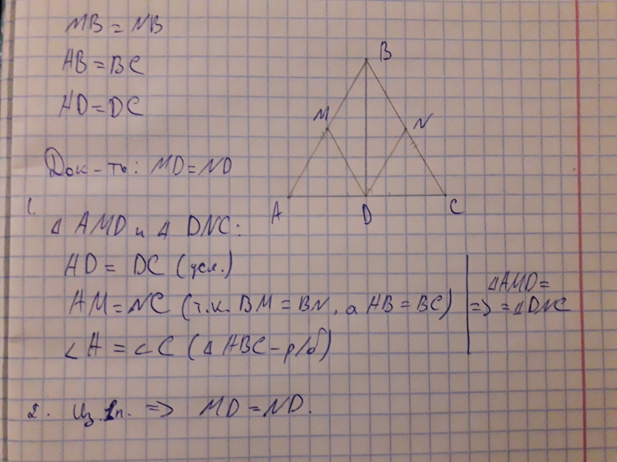 ЗАДАЧА: НА БОКОВЫХ СТОРОНАХ РАВНОБЕДРЕННОГО ТРЕГОЛЬНИКА АВС ОТЛОЖЕНЫ РАВНЫЕ ОТРЕЗКИ BM И BN BD-МЕДИАНА ТРЕУГОЛЬНИКА. ДОКАЖИТЕ ЧТО MD =ND