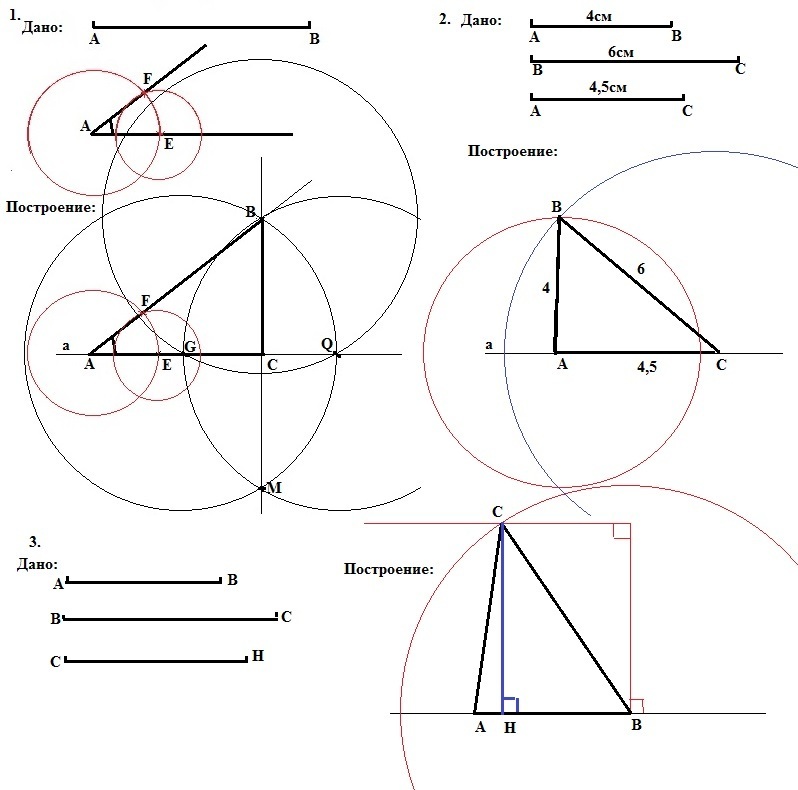 1.Постройте прямоугольный треугольник по гипотенузе и острому углу.