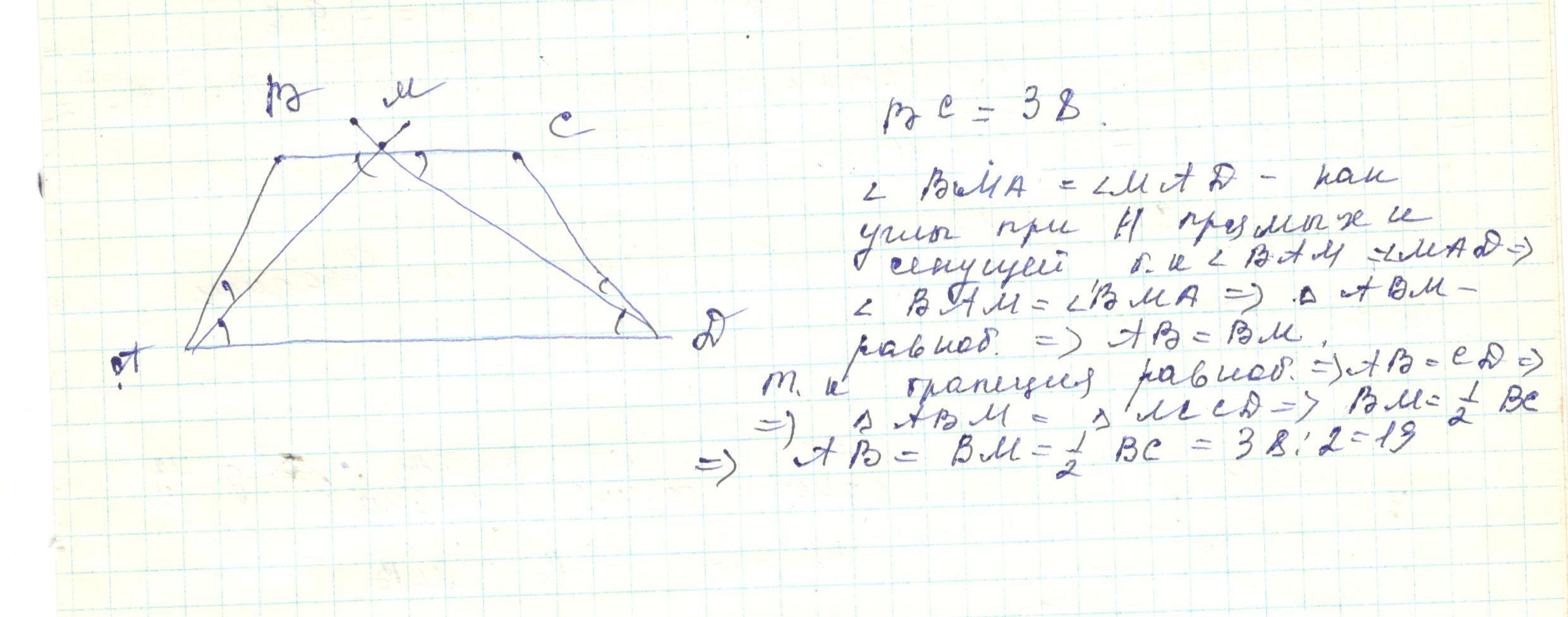 Биссектрисы углов A и D при основании равнобедренной трапеции ABCD пересекаются в точке M,лежащей на основании BC.Найдите ab,если BC=38