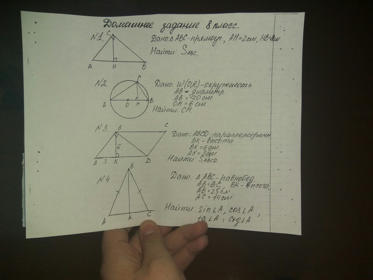 синус угла А =ВК/АВ=24/25 ( по таблице Брадиса найдешь угол) ;косинус угла А =АК/АВ=7/24 (аналогично)