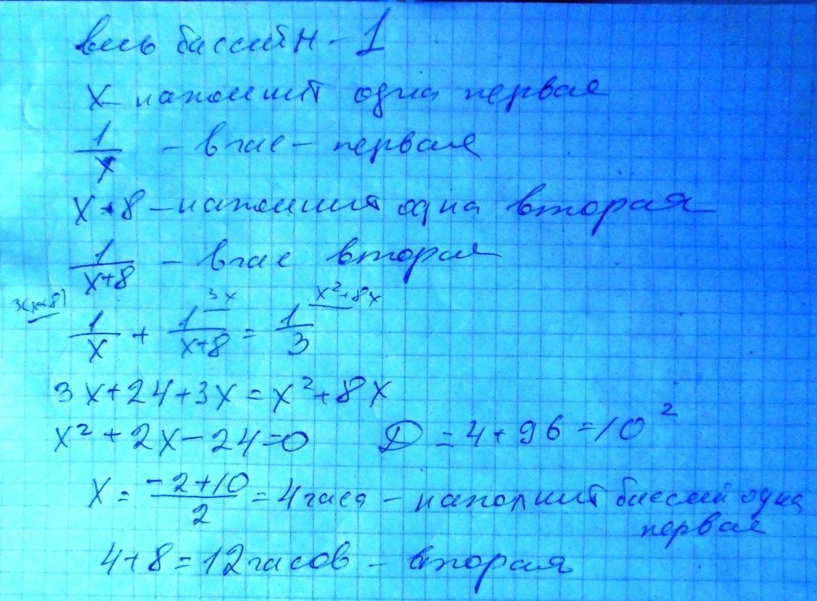 Две трубы вместе наполняют бассейн за 3 часа. Первая труба может наполнить весь бассейн на 8 часов быстрее, чем вторая. За сколько часов может наполнить бассейн одна первая труба?