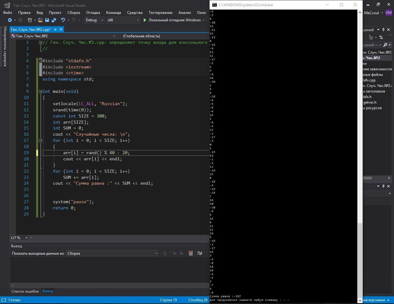 Вычислить и вывести на экран 300 целых чисел, их сумму. Сами числа заданы случайным образом в диапазоне [-20:40]