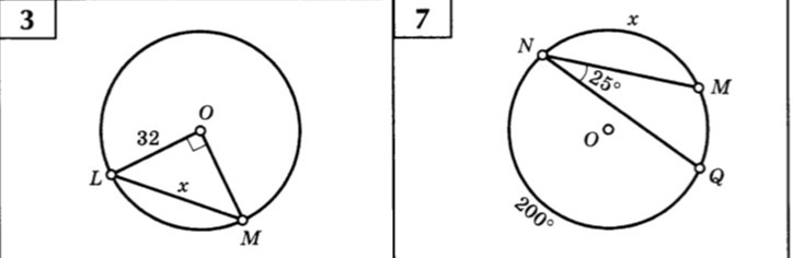 2) Дуга МQ=25·2=50°. Дуга NQM=200+50=250°. х=360-250=110°.