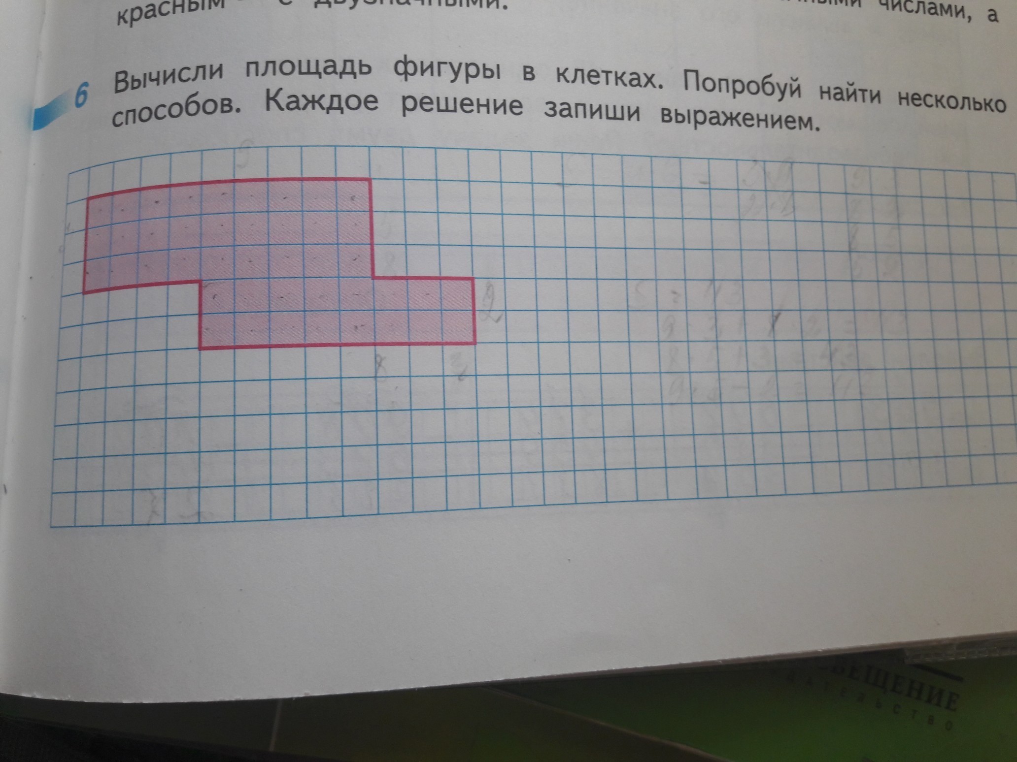 вычисли плошадь фигуры в клетках.попробуй найти несколько способов.каждое решение запиши выражением.