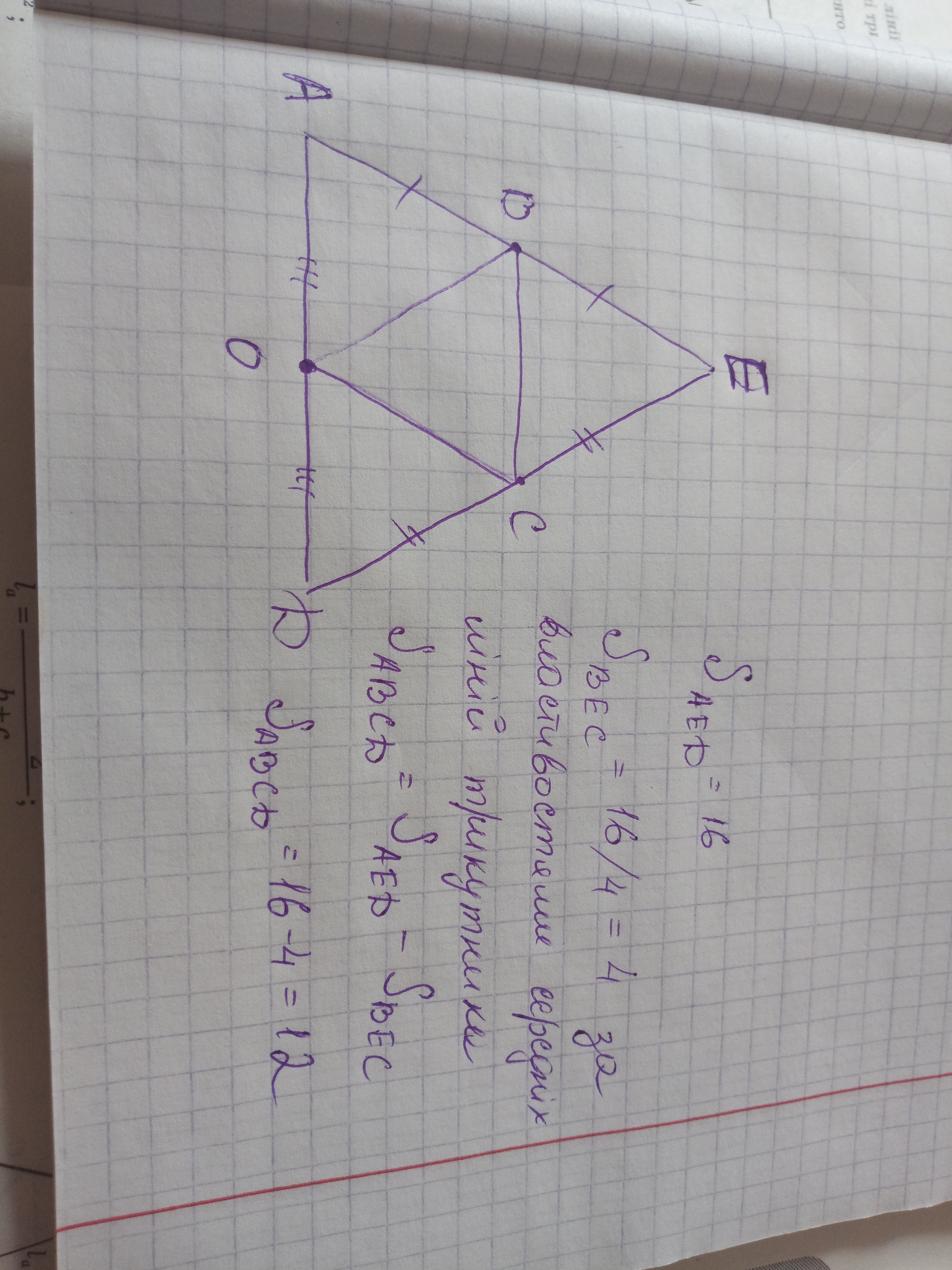 БОКОВЫЕ СТОРОНЫ аб и сд трапеции абсд продолжены до пересечения в точке е. сторона бс является средней линией треугольника аед. найдите площадь трапеции если площадь треугольника аед равна 16