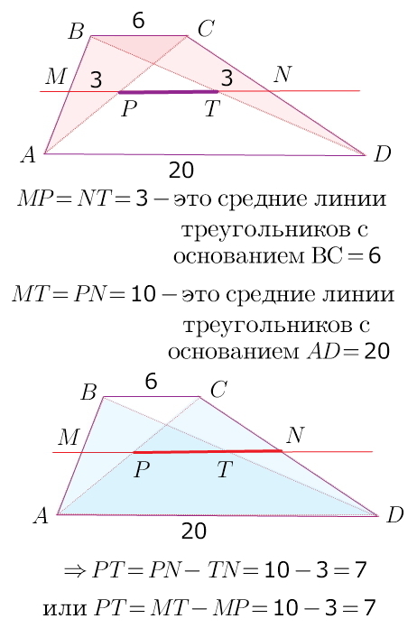 достаточно рассмотреть получившиеся треугольники ивспомнить, что средняя линия треугольника = половине стороны (основания), к которой она параллельна))итог: этот отрезок = полу-разности длин оснований трапеции...(20 - 6) / 2 = 14 / 2 = 7