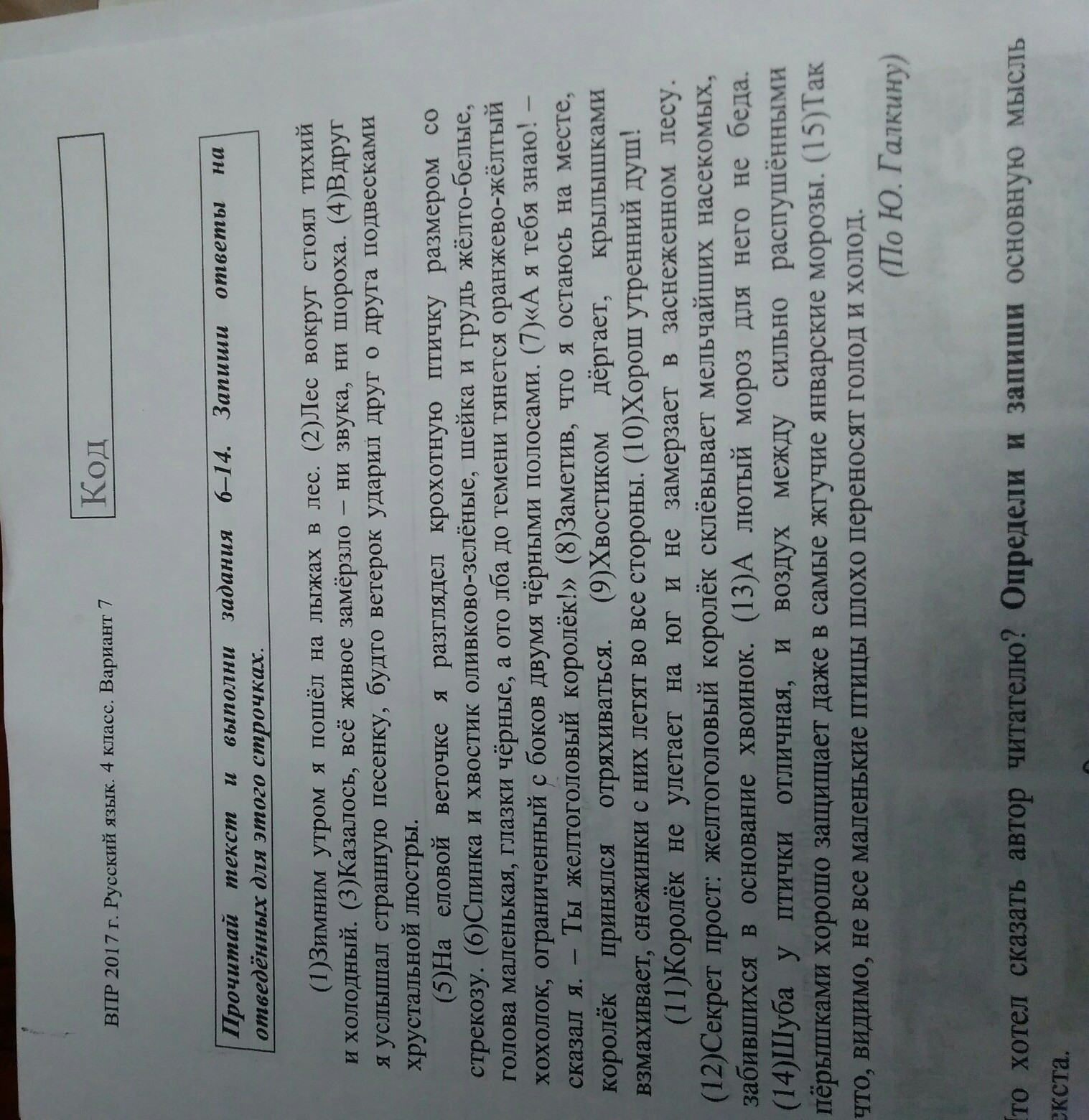 Основная мысль: однажды морозным , зимним утром я гулял в лесу , и вдруг увидел маленькую , но переносящую морозы пташку.