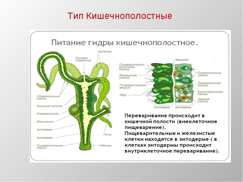Название систематической единицы эти животные получили благодаря одноименной структуре. Она именуется кишечной полостью, и ее имеют все представители типа: и полипы, ведущие прикрепленный образ жизни, и активно передвигающиеся медузы. Характеристика типа кишечнополостных также заключается в наличии специализированных клеток. Но несмотря на такую прогрессивную особенность строения, тело этих животных не образует настоящих тканей.