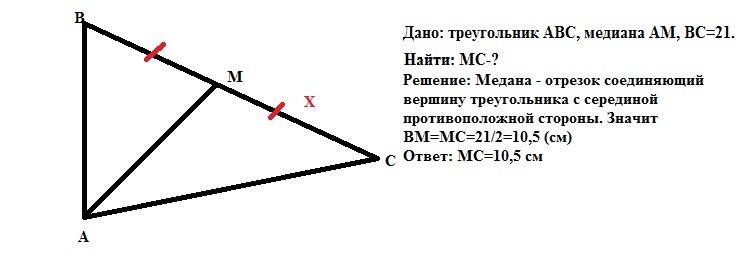 АМ делит ВС пополам, значит, ВС=2МС, МС=0,5ВС=21:2=10,5см