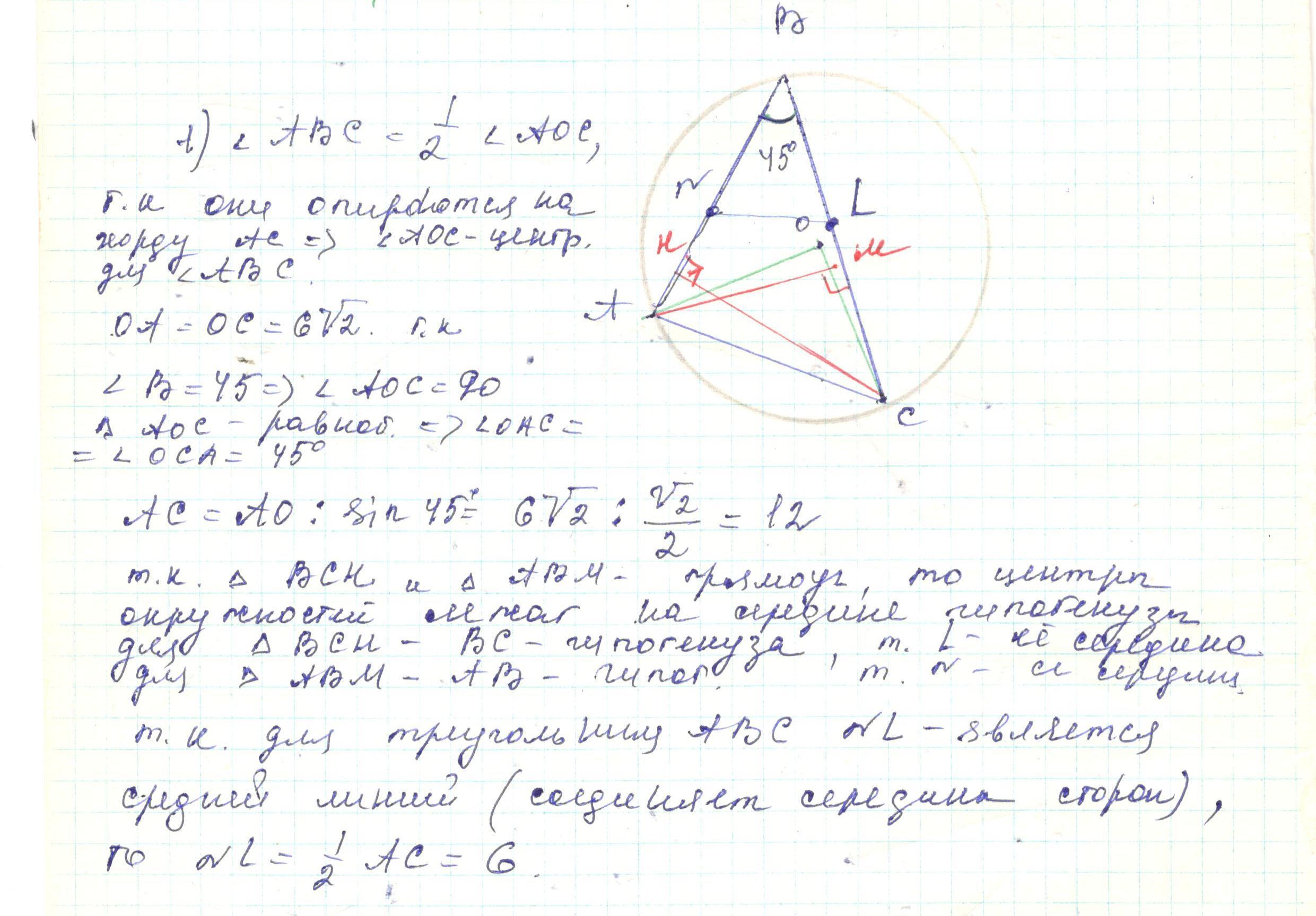 в остроугольном треугольнике авс с углом в=45 и радиусом описанной окружности ,равным 6корней из 2, проведены высоты ам и сн. найдите длину отрезка, соединяющего центры окружностей ,описанных около треугольников всн и авм
