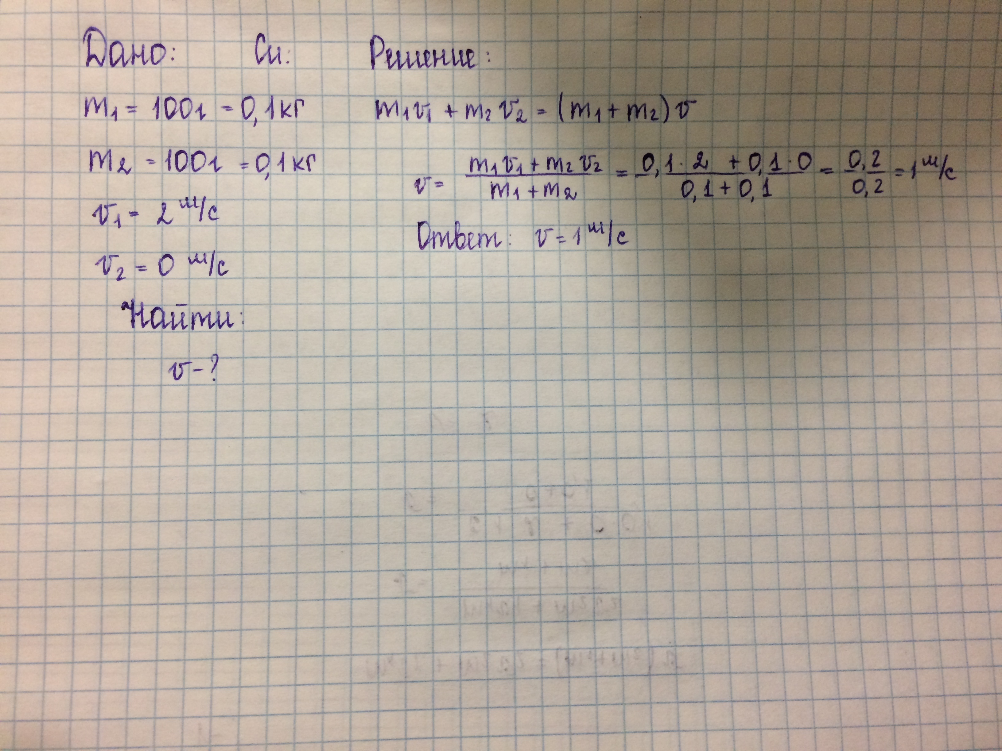 Куля масою 100 г, що рухалася зі швидкістю 2 м/с, налітає на нерухому кулю такої самої маси. Визначте швидкість, з якою будуть рухатися кулі після абсолютно непружного удару. (У відповіді повинне бути тільки число в СІ)