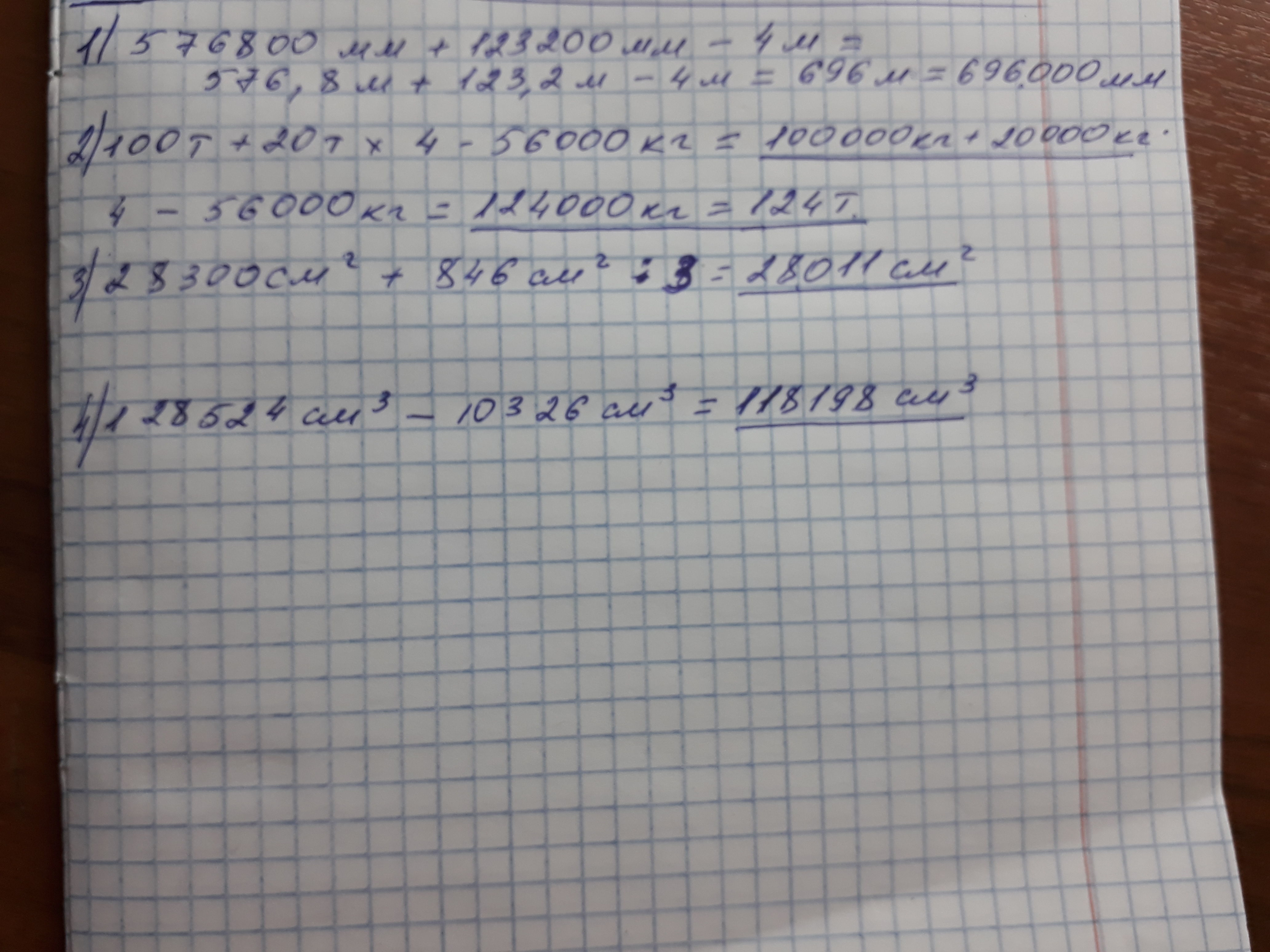 выполнить действия с величинами в 1) 576800 мм + 123200 мм - 4 м; 2)100 тонн + 20 тонн x 4 - 56000 кг; 3)28300 см в квадрате + 846 см в квадрате : 3 ;