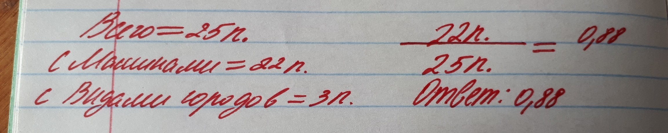 Родительский комитет закупил 25 пазлов для подарков детям на окончание года, из них 22 с машинами и 3 с видами городов. Подарки распределяются случайным образом. Найдите вероятность того, что Диме достанется пазл с машиной.