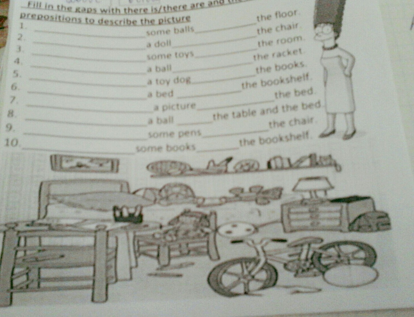 Fill in the gaps with there is / there are and the necessary prepositions to describe the picture