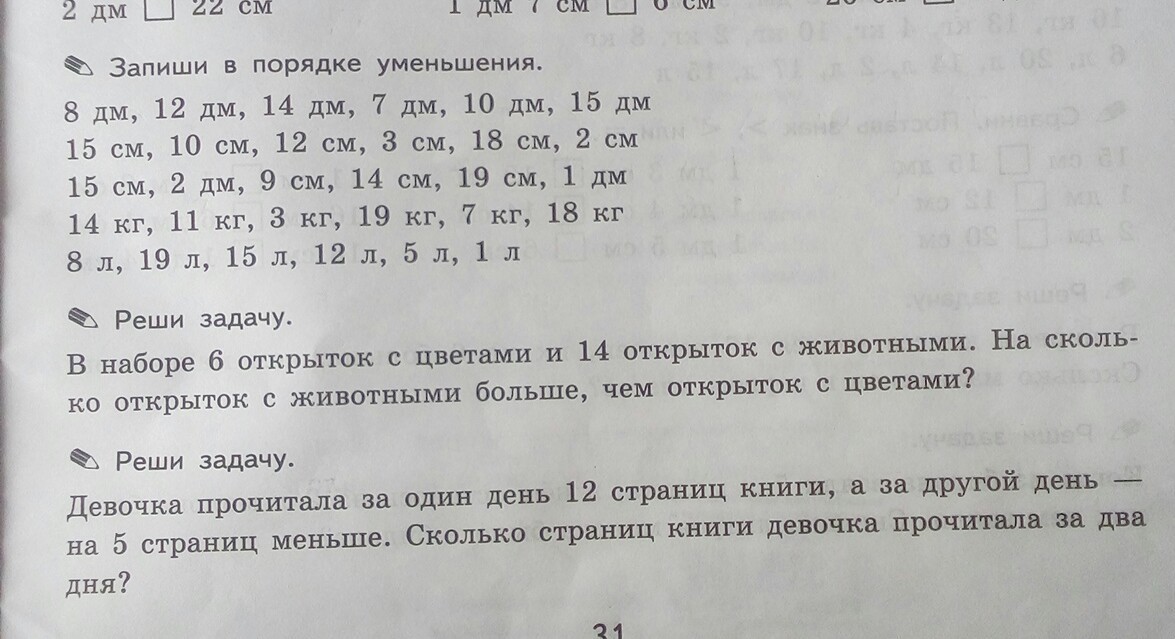 1)15дм, 14дм, 12 дм, 10дм, 8дм, 7дм2)18см, 15см, 12см, 10см, 3см, 2см3)2дм, 19см, 15см, 14см, 1дм, 9см4)19кг, 18кг, 14кг, 11кг, 7кг, 3кг5)19л, 15л, 12л, 8л, 5л, 1л