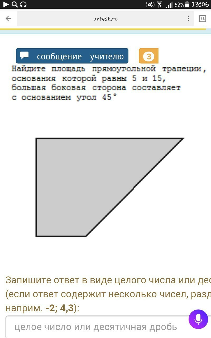 Проводишь высоту. Получается треугольник с прямым углом. Угол равен 45 в прямоугольном треугольнике следовательно, он равнобедренный. Значит высота равна = 10. Площадь трапеции равна (15+5) /2 *10=100
