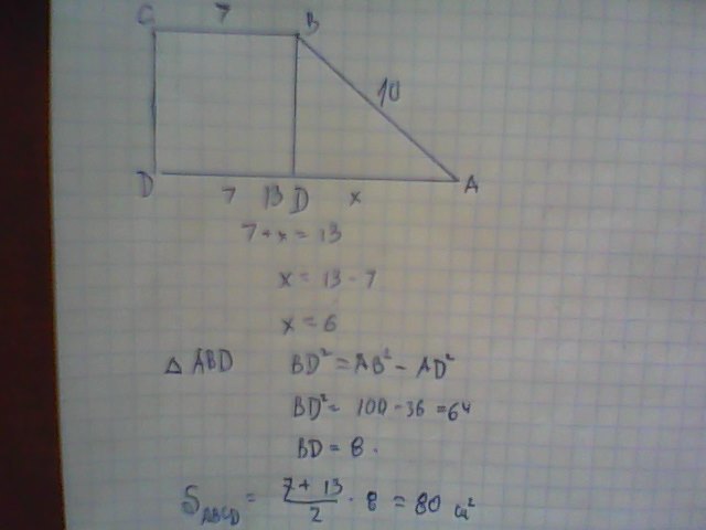 В прямоугольной трапеции основания 13 см и 7 см. Найдите площадь этой трапеции, если известно, что большая боковая сторона равна 10 см