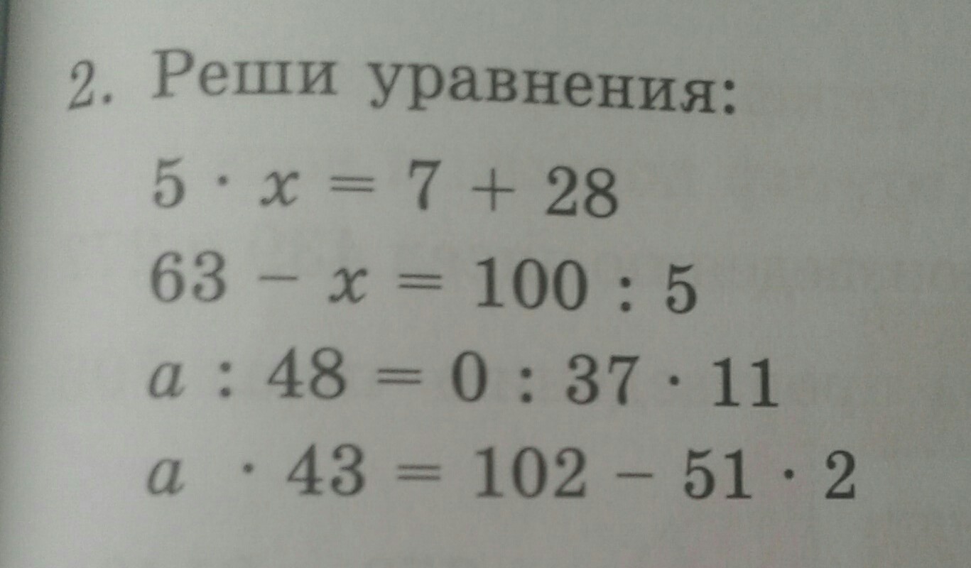 реши уравнение 5 умножить на икс равно 7 плюс 28 и 63 минус икс равно 100 / 5 / 48 равно 0 / 37 X 11 x 43 равно 102 - 51 x 2