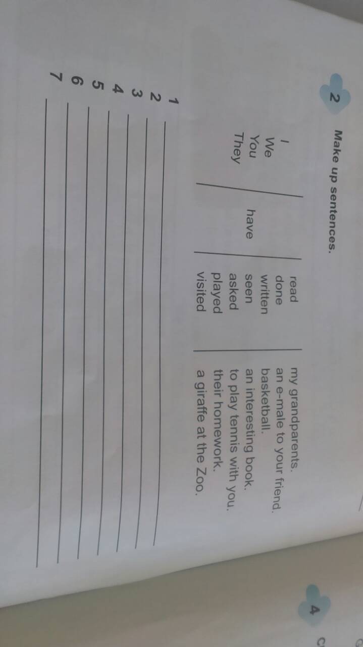 2. Make up sentences.1, I have read an interesting book.2, They have done their homework. 3, We have played basketball. 4, You have written an e-male to your friend.5, They have seen my grandparents. 6, We have asked to play tennis with you.7, I have visited a giraffe at the zoo.