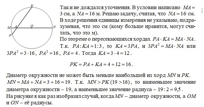 хорды MN и PK пересекаются в точке A так, что MA= 3 см, NA= 16м, PA : KA= 1 : 3. Найдите PK и наименьшее значение радиуса этой окружности.