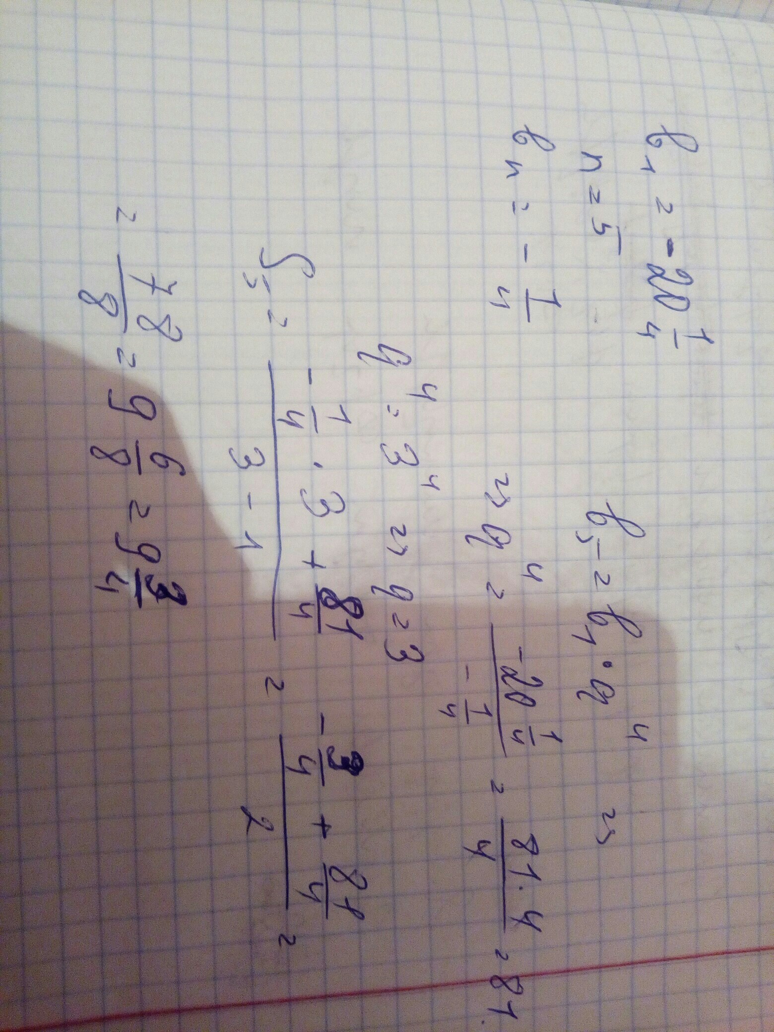 определить знаменатель и сумму членов геометрической прогрессии , в которой b1=-20 1/4, n=5,bn=-1/4