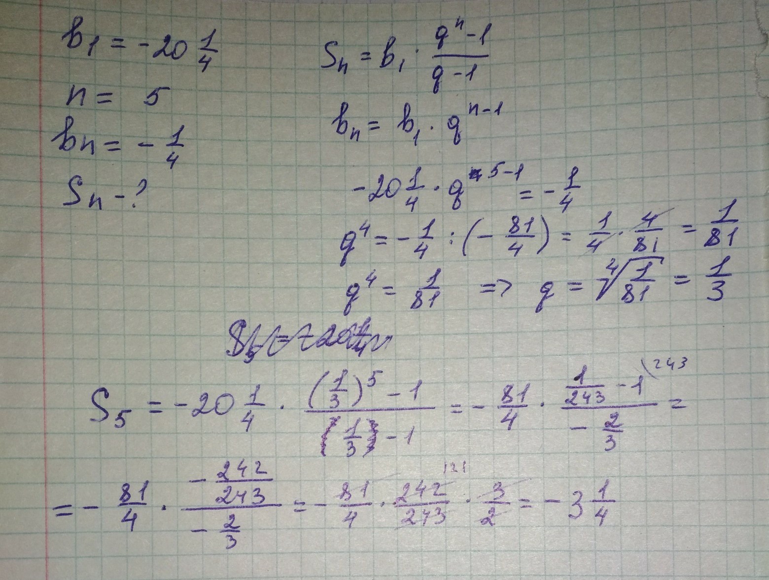 определить знаменатель и сумму членов геометрической прогрессии , в которой b1=-20 1/4, n=5,bn=-1/4