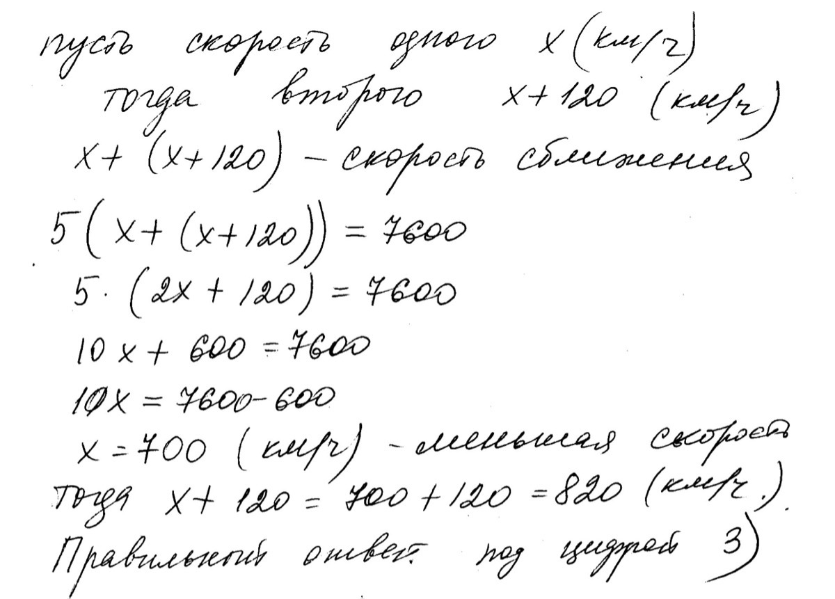 два самолета вылетели одновременно на встречу друг другу из 2 городов,расстояние между которыми 7600км и встретились через 5ч.Если их скорости отличатся на 120 км/ч,то большая скорость составляет?