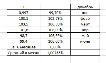 Далее умножаем на результат каждого месяца и получаем, что за 6 месяцев - выросло на 1,05 %
