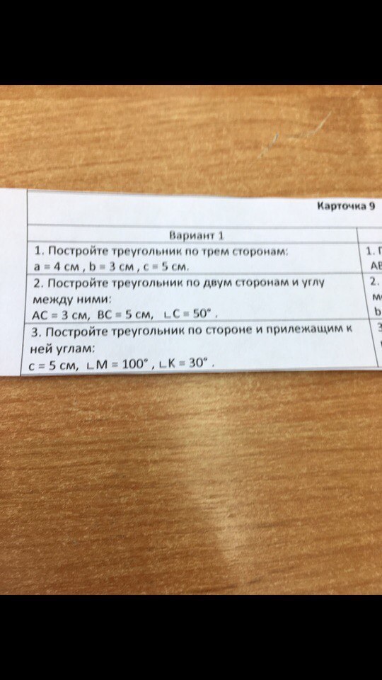 1)Рисуем сторону с длинной 5см. Уже есть точки А и С.Берем циркуль, набираем по линейке длину 4 см (это раствор циркуля).Ставим циркуль в точку А и делаем засечку. Теперь набираем циркулем длину 3см и делаем засечку. Там где дуги пересеклись это и есть точка В. Соединяем точку В с точками А и С.