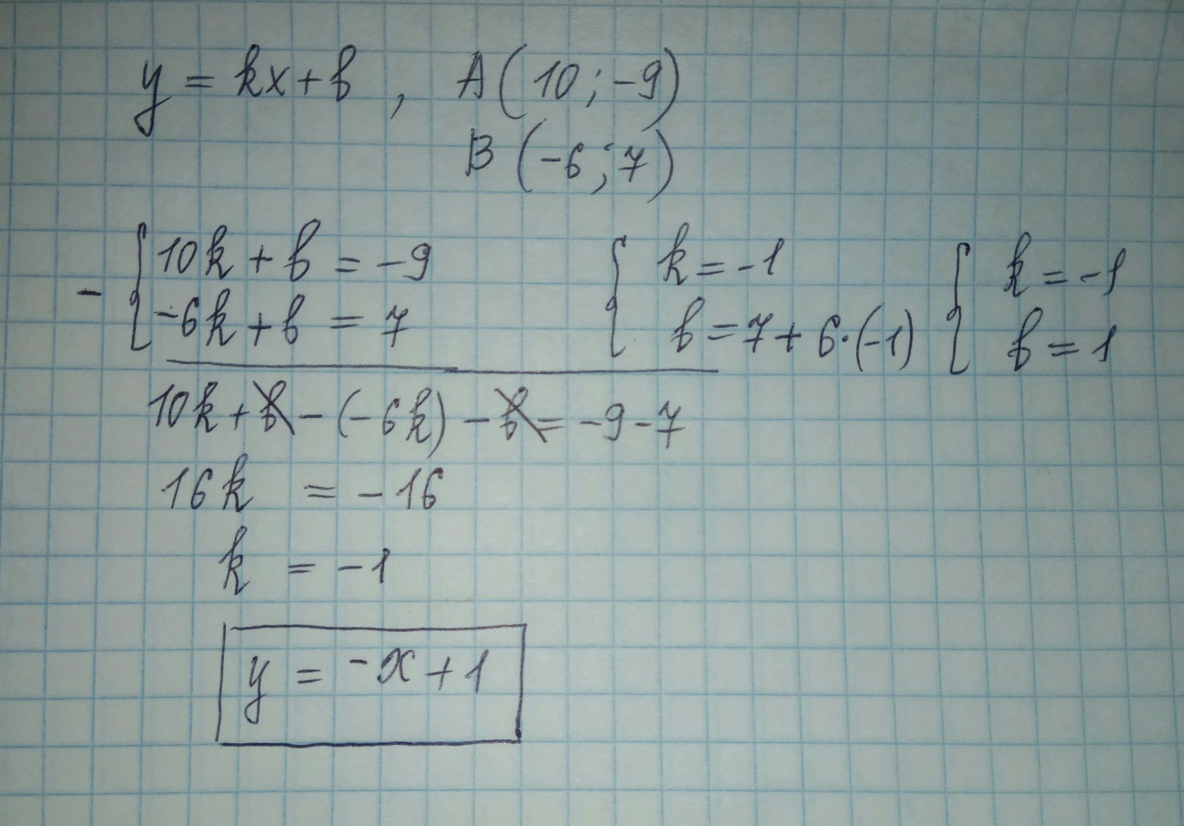 Прямая y=kx+b проходит через точки А(10, -9) и B (-6,7). Напишите уравнение этой прямой.