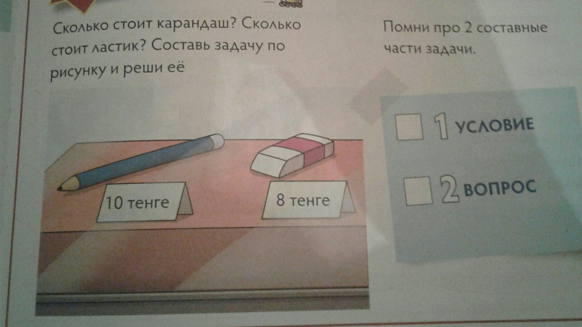 Карандаш стоит 10 тенге, а ластик на 2 тенге меньше. Сколько стоит ластик?