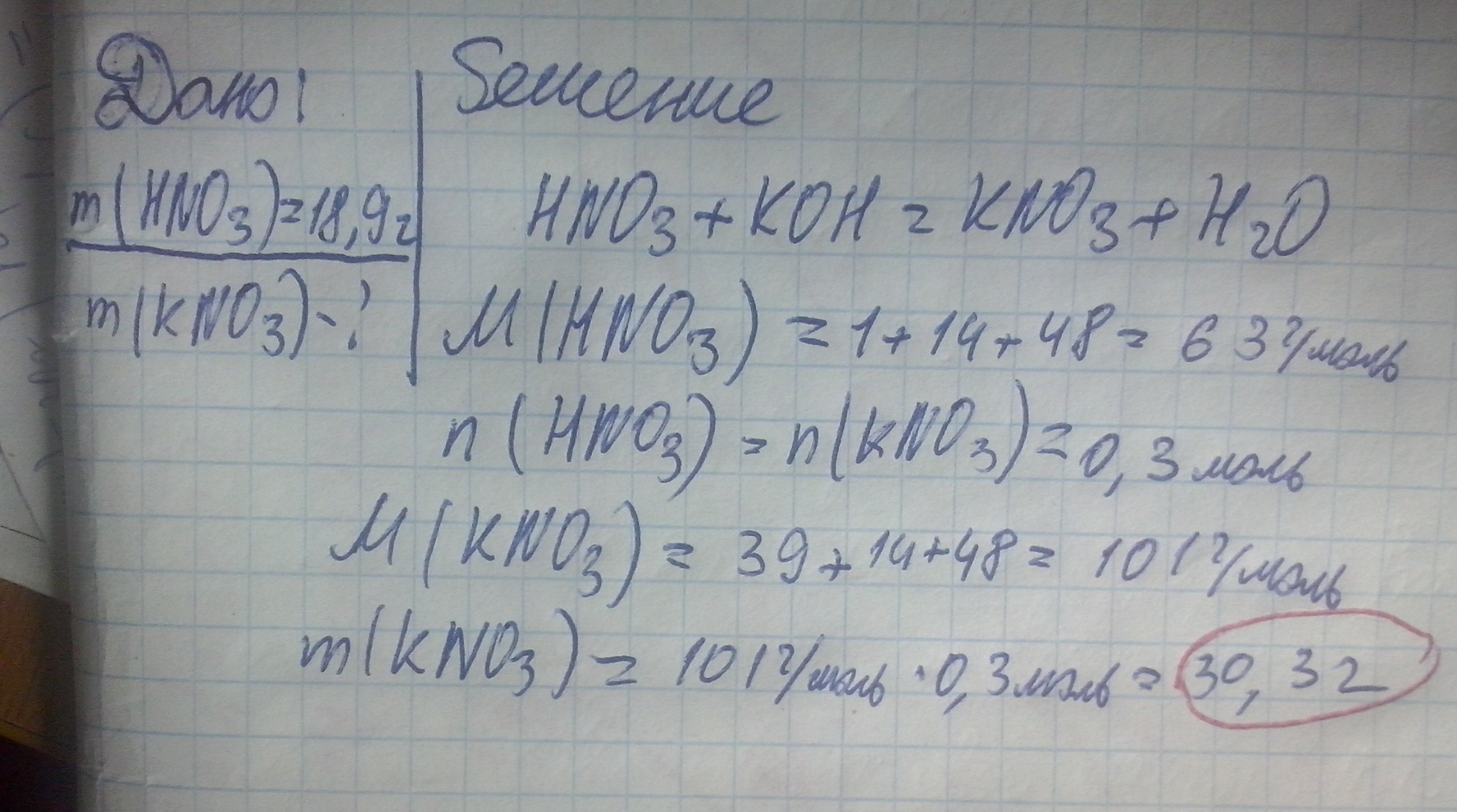 На нейтрализацию калий гидроксида потратили нитратную кислоту массой 18,9 г. Вопрос : Сколько соли получилось (г)