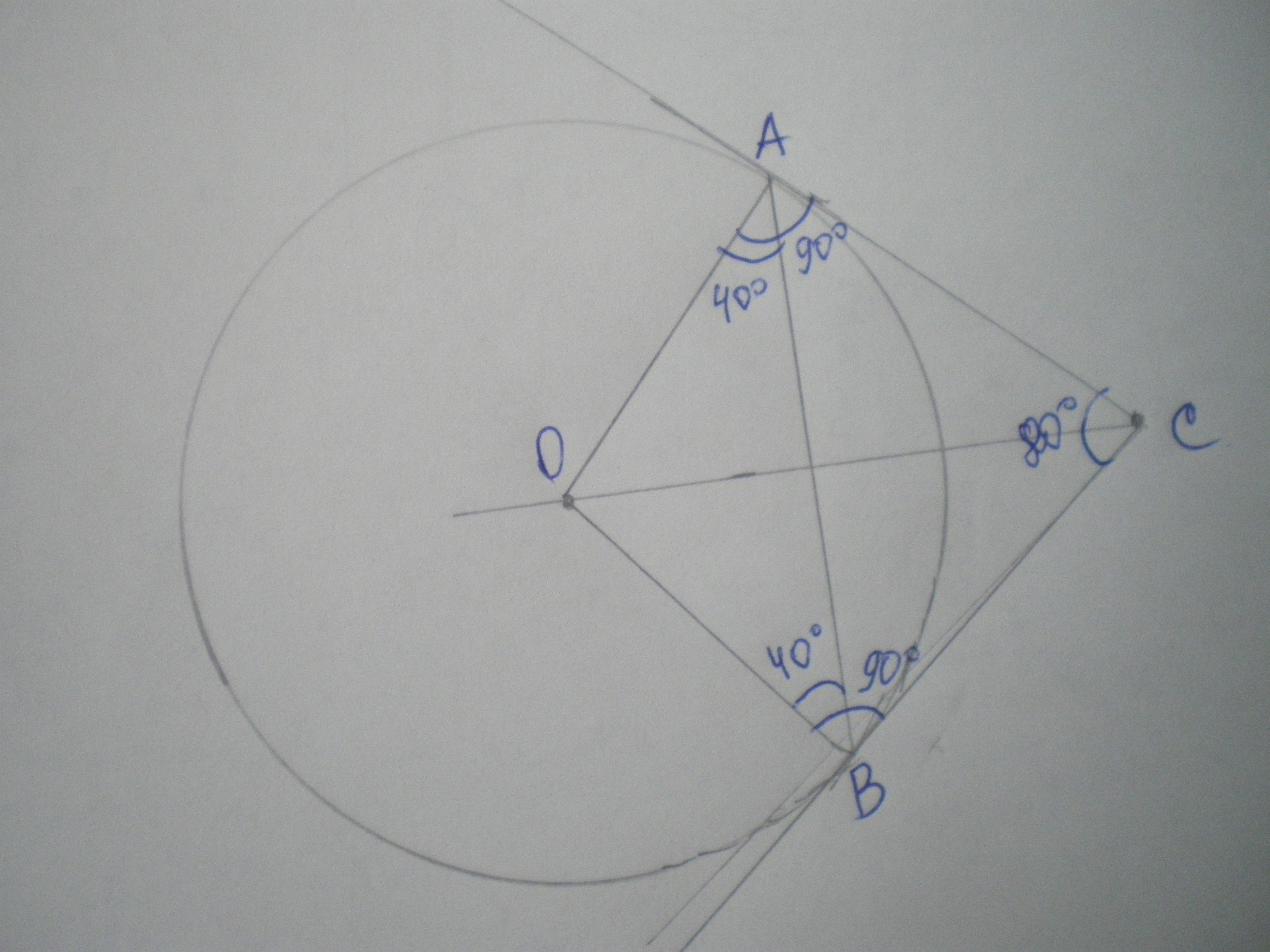 Две прямые касаются окружности с центром О в точках А и В и пересекаются в точке С. Найдите угол между этими прямыми, если 0 ∠ABO = 40 .